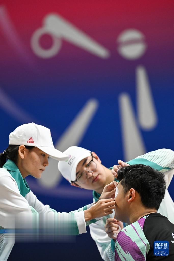 12月12日,在广州举行的全国第十二届残疾人运动会暨第九届特殊奥林匹克运动会盲人门球男子1-8名交叉赛中,山东队10比3战胜安徽队。图为志愿者在比赛开始前为安徽队球员张洋调整眼罩。 新华社记者 胡智轩 摄