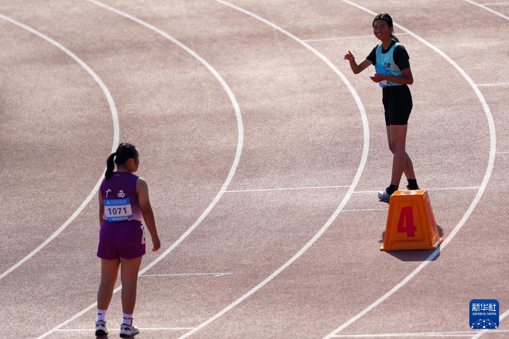 12月12日,全国第十二届残疾人运动会暨第九届特殊奥林匹克运动会特奥田径项目比赛在广东中山举行。图为在女子12-15岁组400米预赛第3组比赛前,西藏队选手丁增朗增(右)和广西队选手符心田交流。 新华社记者 杨晨光 摄