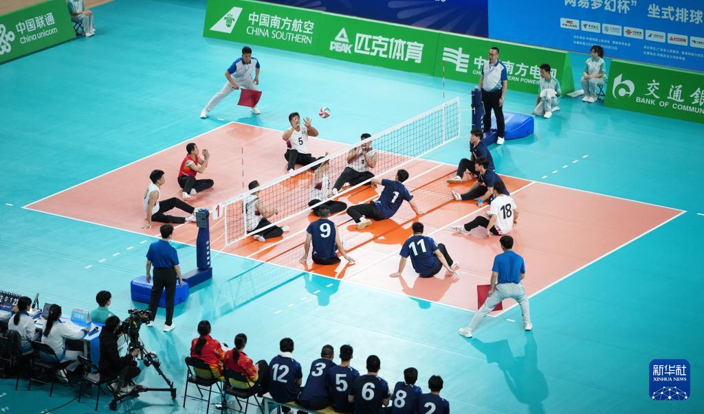 12月11日,在广州举行的全国第十二届残疾人运动会暨第九届特殊奥林匹克运动会坐式排球项目男子组小组赛中,江苏队3比0战胜福建队。图为双方球员在比赛中。 新华社记者 任鹏飞 摄