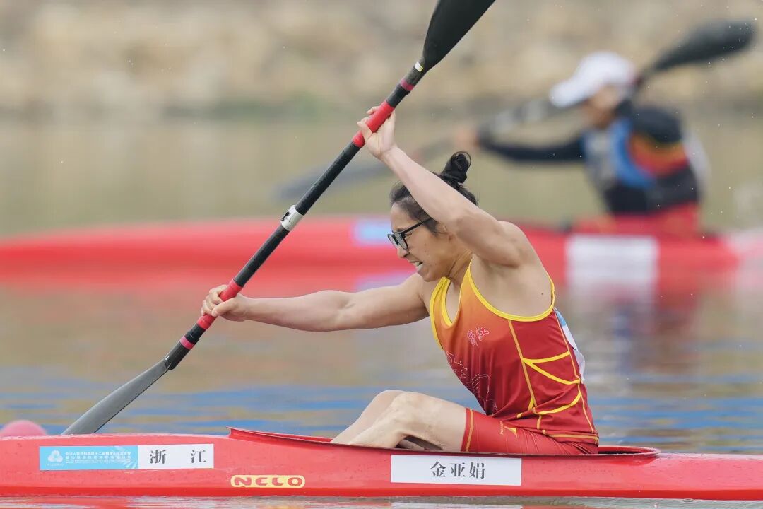 12月11日,全国第十二届残疾人运动会暨第九届特殊奥林匹克运动会皮划艇项目女子500米 KL2级决赛在广东国际划船中心举行。图为浙江队选手金亚娟在比赛中。 王鹏 摄
