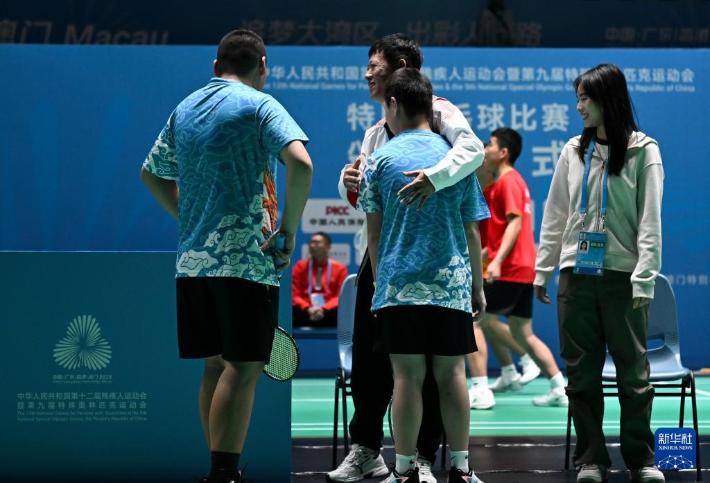12月12日,全国第十二届残疾人运动会暨第九届特殊奥林匹克运动会羽毛球比赛在澳门举行。图为吉林队组合郭一鸣(左)/孙文博在男子16-21岁组双打D组比赛后。他们2比0战胜浙江队组合邱正辉/陈宇翔。 新华社记者 赵子硕 摄