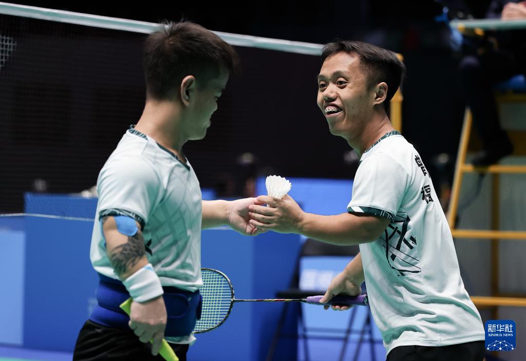 12月11日,全国第十二届残疾人运动会暨第九届特殊奥林匹克运动会羽毛球比赛在澳门举行。图为福建队组合曾庆涛(右)/罗广梁在SH6男子双打1组比赛中。最终,他们2比0战胜重庆队组合钟熙行/李建华。 新华社记者 毛思倩 摄