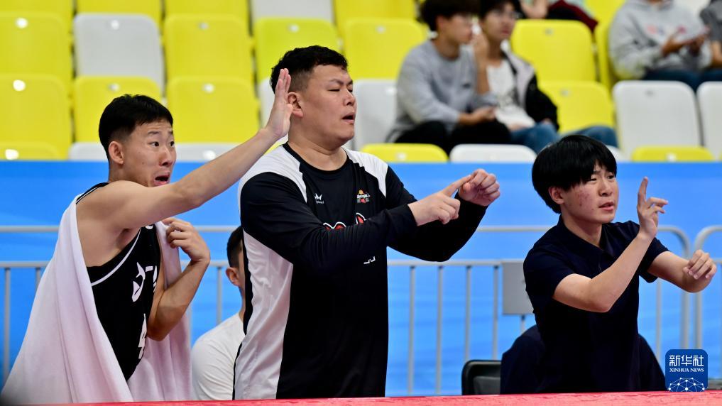 12月11日,在广东佛山举行的全国第十二届残疾人运动会暨第九届特殊奥林匹克运动会聋人篮球男子组小组赛A组比赛中,广东一团队109比56战胜河南队。图为河南队成员在场边使用手语与场上球员交流。 新华社记者 吴青昊 摄