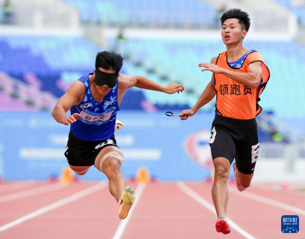 12月11日,全国第十二届残疾人运动会暨第九届特殊奥林匹克运动会田径男子100米T11级决赛在广州举行。图为辽宁队选手赵平安(左)和领跑员钟才在男子100米T11级决赛中。最终,他获得冠军。 新华社记者 刘梦琪 摄