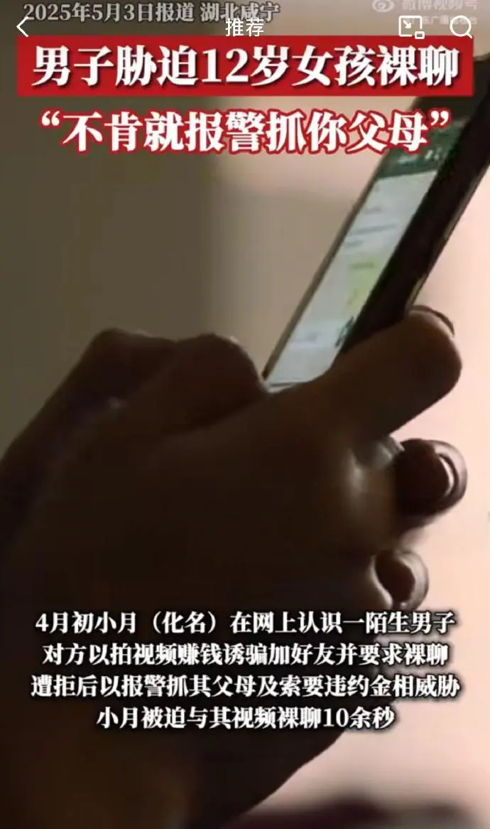 2025年4月初,湖北咸宁12岁女孩小月怎么也没想到,这句看似普通的邀约,竟是一场噩梦的开始。陌生男子熊某通过社交平台步步设套,先以“轻松赚钱”引诱添加好友,随后撕下伪装,威胁不裸聊就报警抓你父母!