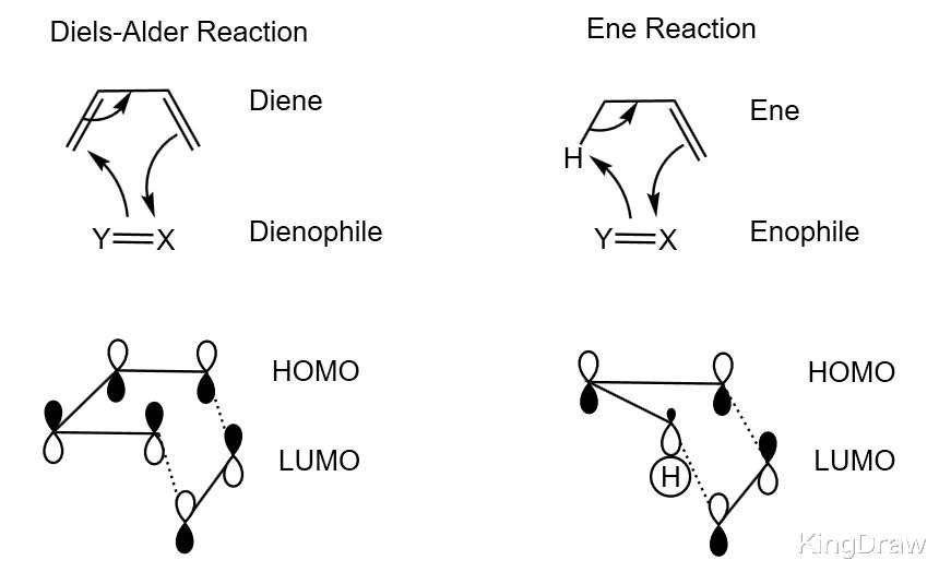 与经典的 Diels-Alder 反应不同,在 Ene 反应中,烯烃扮演的角色类似于 Diels-Alder 反应中的二烯体,而亲烯体则相当于亲二烯体,但它们的电子需求通常是相反的,即烯烃是富电子的,而亲烯体是缺电子的。尽管如此,电子需求反转的情况在某些条件下也可能发生,但不如 Diels-Alder 反应常见。