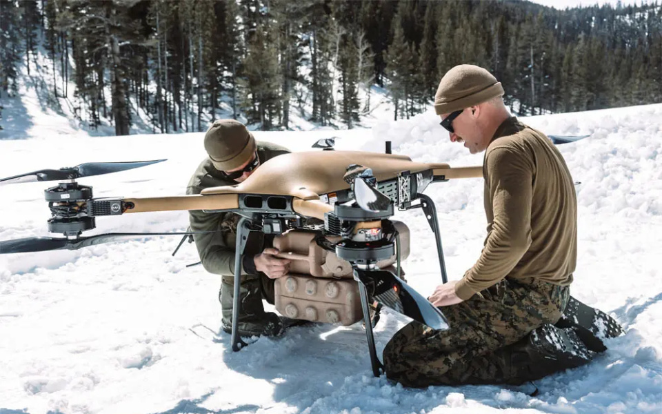 在山地训练2-25演习期间,两名海军陆战队员在布里奇波特山地作战训练中心将装满水的油桶安装到150无人机上。这种无人机将成为该部队未来装备的重要补给方式,展示了现代战争中的创新思维。