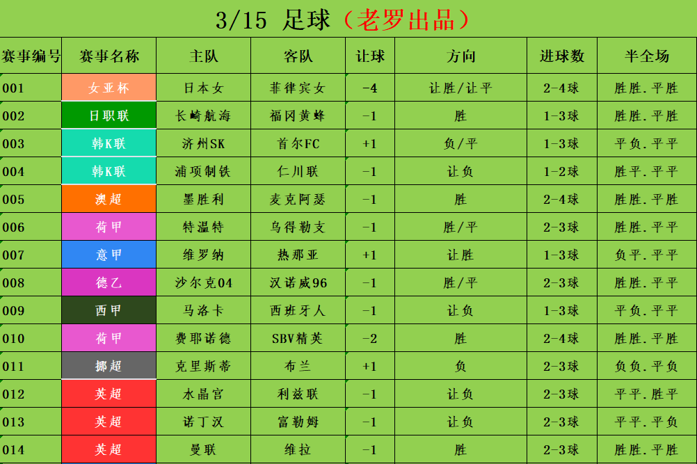 从目前的市场数据整体调整来看,虽然给到了水晶宫支持,但是整体对于平局的警惕性很高,这也非常符合本场比赛两支球队的一个具体分析,而目前来说,水晶宫保级压力不大,对于欧协联的战意是有的,那这场比赛,各拿一分自然就皆大欢喜,综合考虑,本场老罗看好利兹联不败,让负博平。