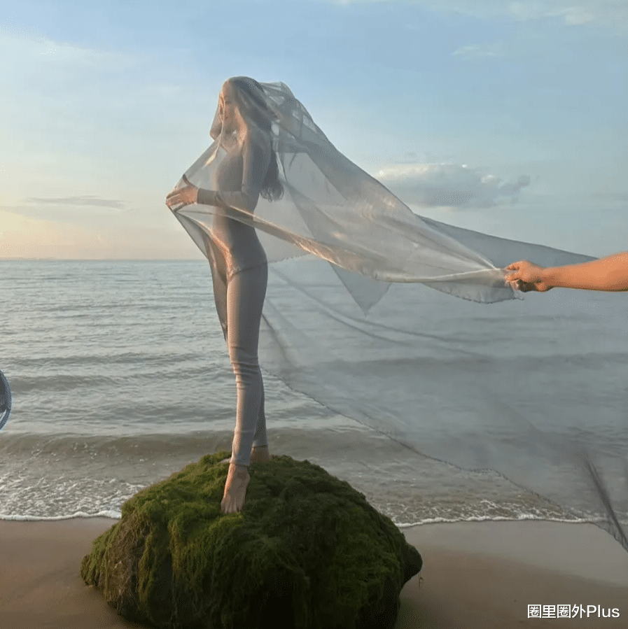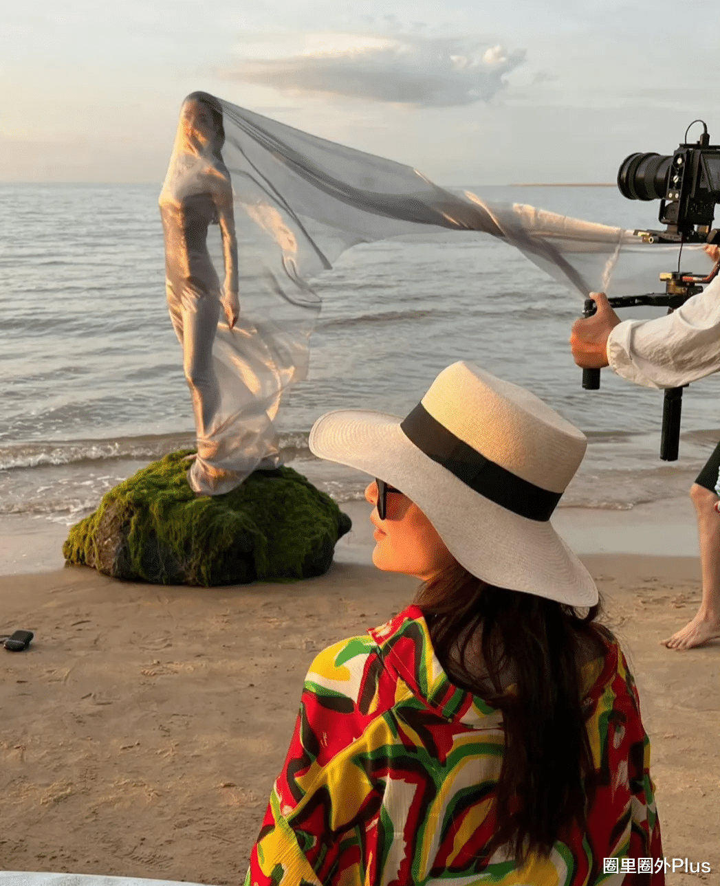 画面中,舒淇宛如一位刚从海面升起的人鱼姬,微风轻拂,丝巾飘动,仿佛是恋人的温柔触碰。海天一色,夕阳下的光影与薄纱丝巾交织,完美地勾勒出她的曼妙身姿,视觉冲击力十足。