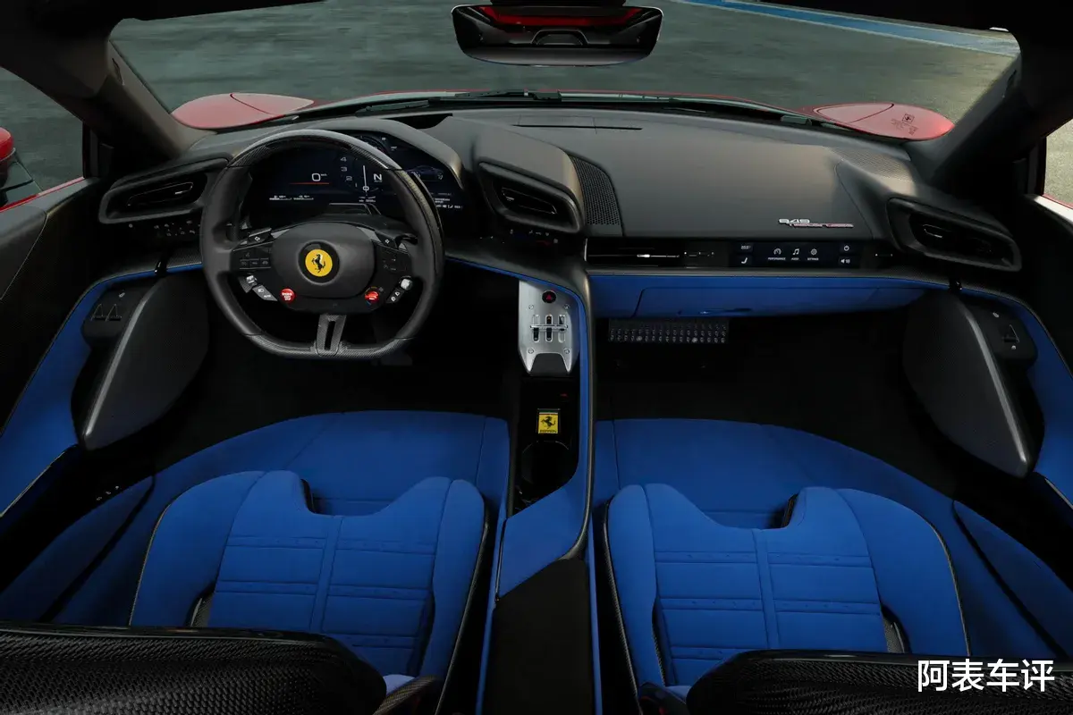 车尾源自经典512 S赛车的双尾翼结构与主动式扰流板协同工作,在时速达到250公里时可额外产生100公斤的下压力。最终,整车在相同时速下能产生高达415公斤的总下压力,相比SF90 Stradale提升了25公斤。这一切意味着,它的每一个进气口、每一条轮廓都不是为了美观而随意刻画,而是极致功能导向下的必然形态。
