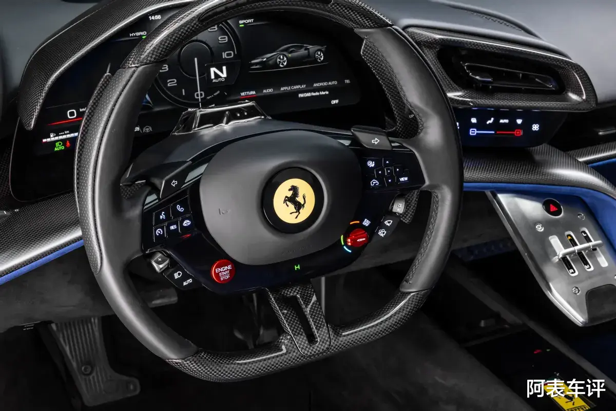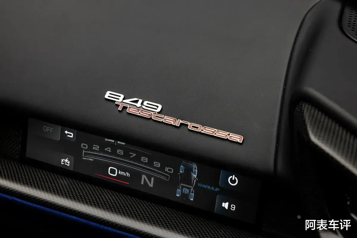 步入车内,849 Testarossa在传承与革新间找到了新的平衡点。座舱延续了以驾驶者为中心的单座赛车理念,水平布局的仪表盘和悬浮式C形出风口营造出强烈的环绕感;方向盘上,标志性的实体启动按钮与全新的 eManettino 旋钮并列,后者可轻松切换纯电、混动、性能等驾驶模式,象征着新旧时代的交融。