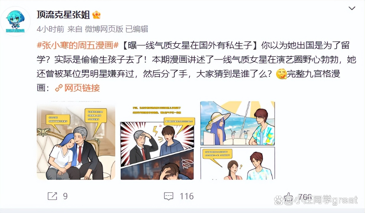 “娱圈狗仔” 张小寒以一组漫画为 “剧本”,详细描述出事件过程:一位为求事业进阶的一线女星,将目光投向圈内 “Q 哥” 大佬,凭借美貌与主动攻势成为对方红颜知己。她也深知 “以色事人” 难以长久,于是选择以生育孩子来维系关系。碍于大佬有家室,双方谋划以 “出国游学” 为幌子,安排女星赴海外产子。产后女星匆匆归国,孩子则交由母亲照料。