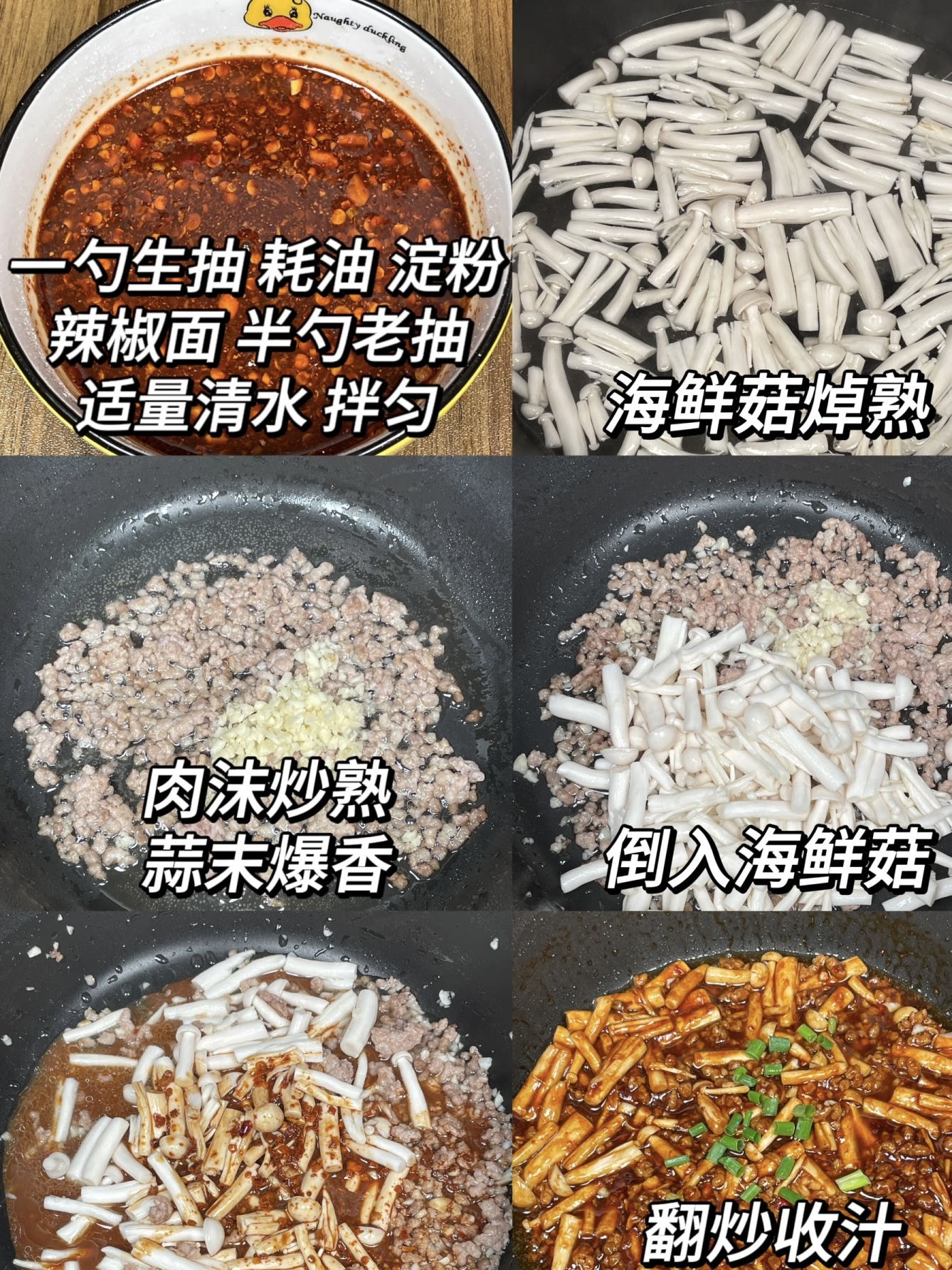先把食材排个队:海鲜菇一盒(也叫蟹味菇,白白胖胖像小珊瑚),猪肉末二两(肥三瘦七最香,懒人可以直接买现成),大蒜三瓣(别怕多,它负责灵魂),干辣椒面半勺(不吃辣换成小米辣也行),生抽、老抽、蚝油、淀粉各一勺,再来半碗清水。调料就这些,没八角也没香叶,家常到邻居家都能借齐。
