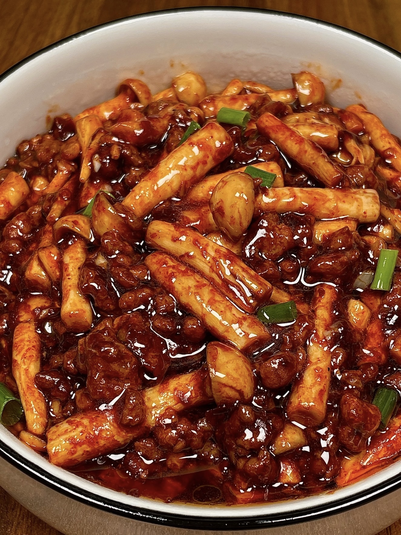 转中火,让蘑菇在汤汁里打滚,肉末的小颗粒钻进菌褶,像给它们穿了件毛衣。汤汁咕嘟冒泡,渐渐变稠,用铲子推一下,能露出锅底“干净的一条线”就说明到位了。关火前撒一把葱花,绿点点缀,颜值瞬间从路人甲变网红。