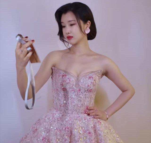 视频里她穿着粉色抹胸礼服,化着粉色系妆容,戴着粉色大耳环,这一套颜色是真协调。