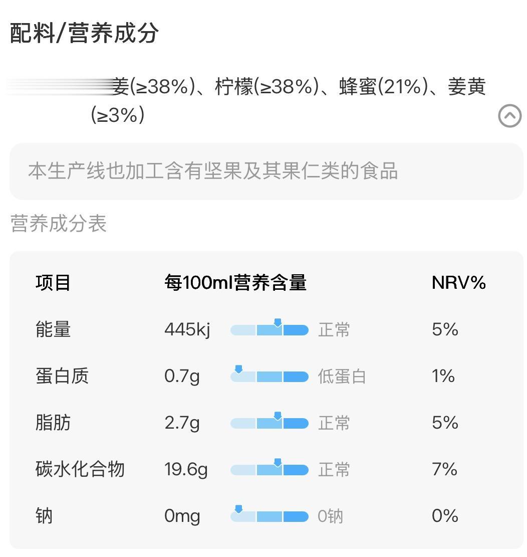 据山姆配料表,旗下的姜黄饮品每100ml含有32g的糖。维乐鲜、有乐岛等品牌的姜黄饮也大都加入了蜂蜜、菠萝汁、橙汁等成分,每瓶饮料中的糖分含量均超过10g。