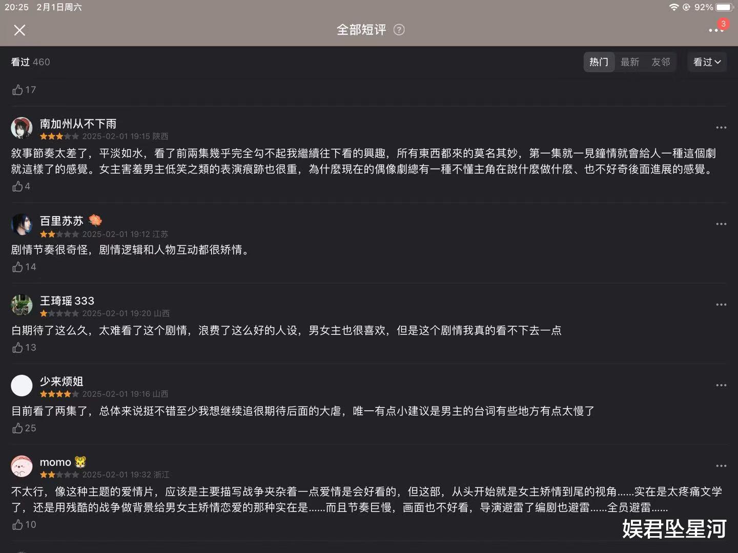 这部剧在爱奇艺首播6集,立马登上蹿升榜第1,2小时站内热度突破5000,对于现偶剧来说热度还不错。首播口碑也出来了,大部分观众都评价太无聊了,叙事节奏差,平淡如水,给人一种不懂主角现在在做什么说什么的感觉,也不好奇后面感情进展。