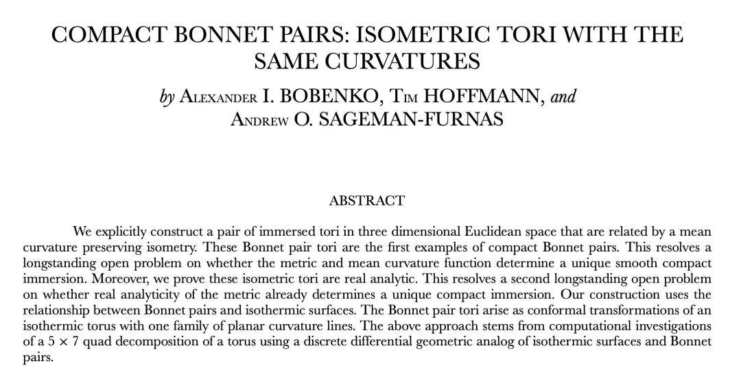 论文标题:Compact Bonnet pairs: isometric tori with the same curvatures