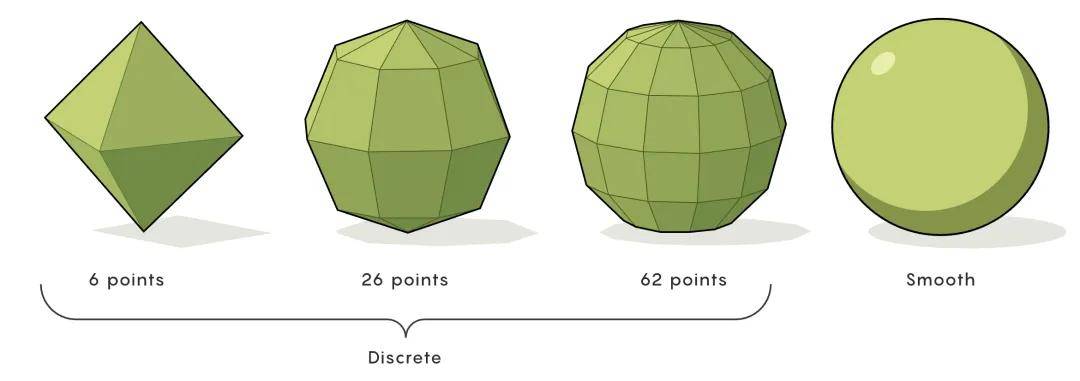 要构建一个离散曲面,需要选取有限数量的点,并用线段将它们连接起来,形成一个由平面构成的形状。通过选择不同的点,可以用不同的方式来表示同一个光滑曲面。例如,下面就是几种表示球体的方式:
