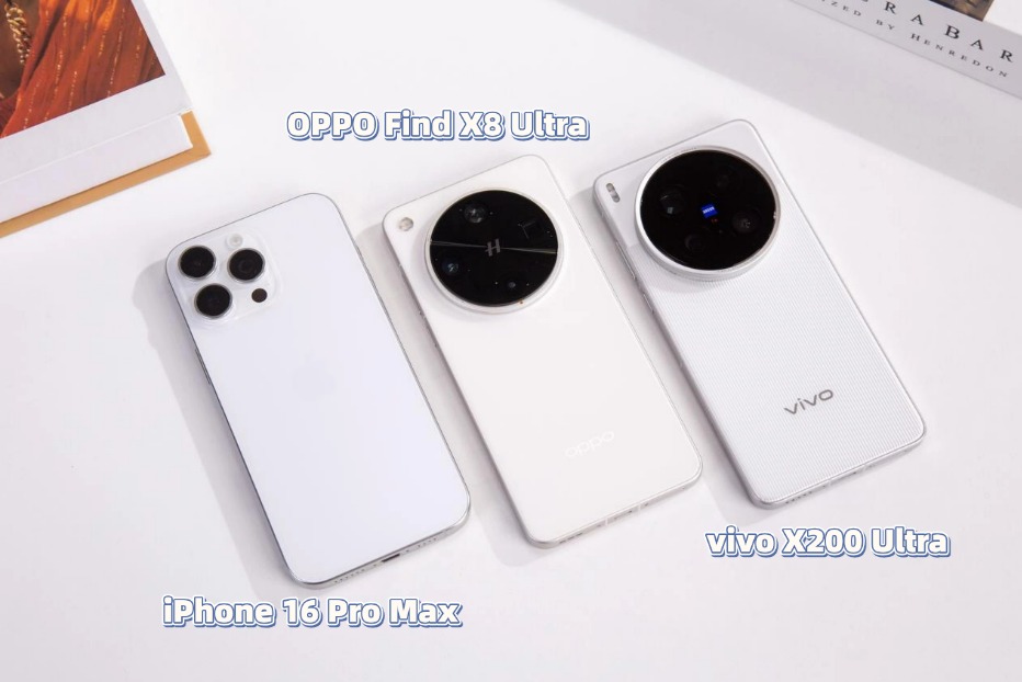 (从左到右依次是iPhone 16 Pro Max、OPPO Find X8 Ultra、vivo X200 Ultra)