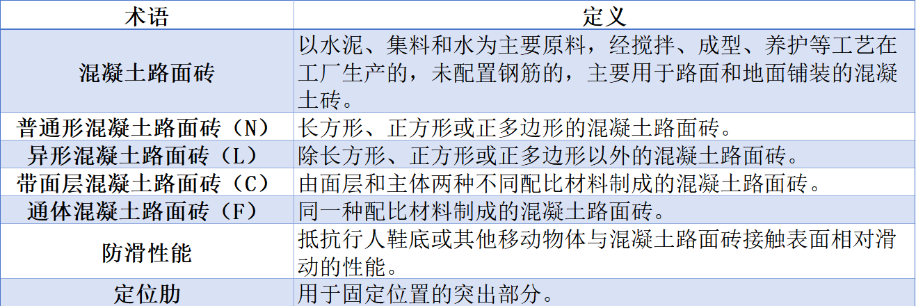 (六)术语和定义:混凝土路面砖、普通形、异形、带面层、通体、防滑性能、定位肋。