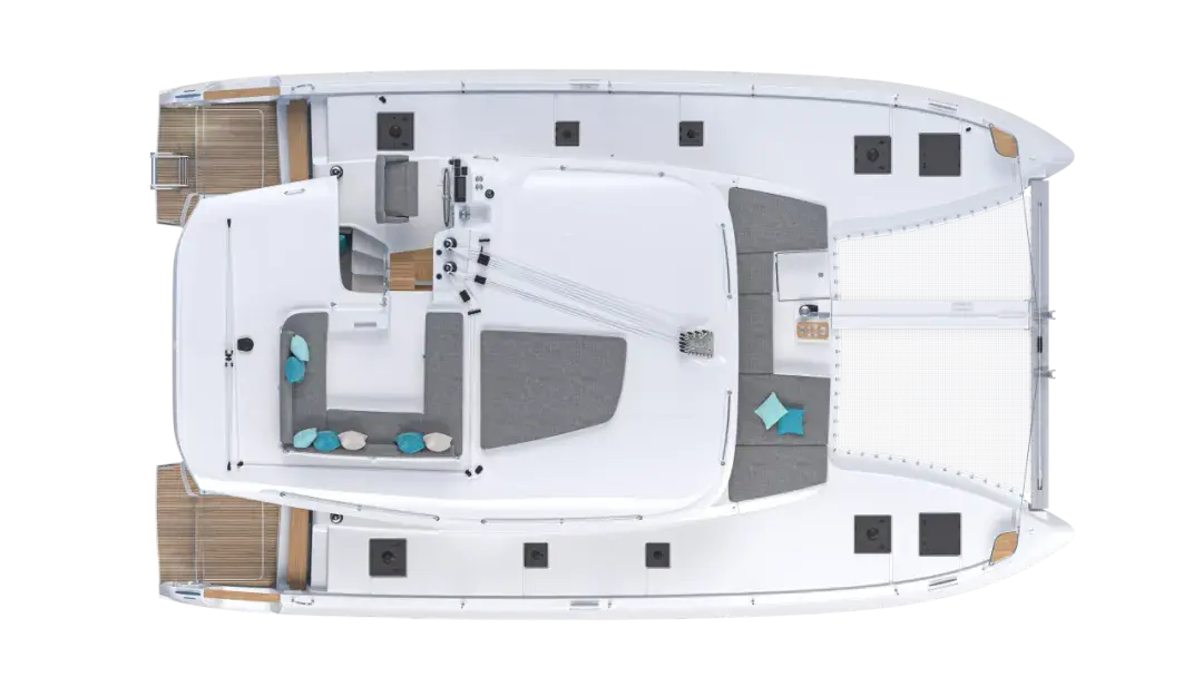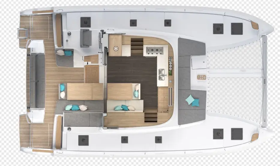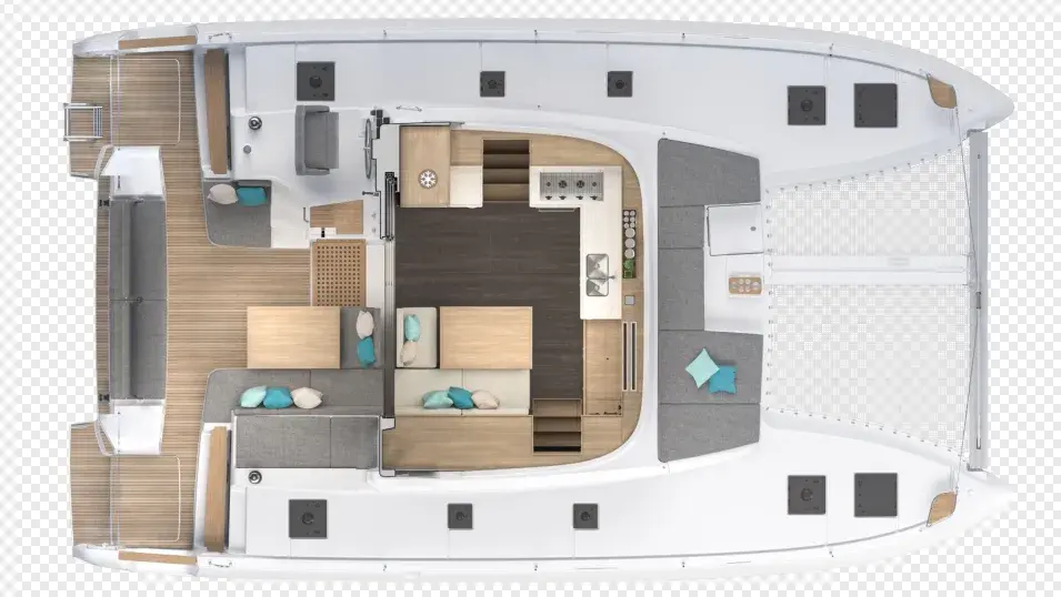 蓝高43呈现蓝高双体船所具备的关键优势:船上提供流畅的移动,后围与船艉休闲区仅一步之遥,加强了易于移动性以及与生活空间的联系。