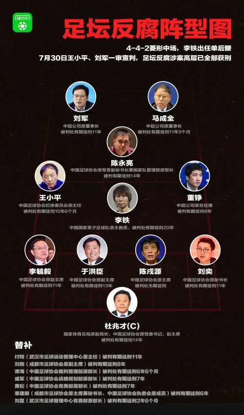 2024年底,中国足球系列腐败案进入宣判季,杜兆才、刘奕、李铁、刘刚等前中国足协、地方足协要员以及足坛人士被逐一宣判。