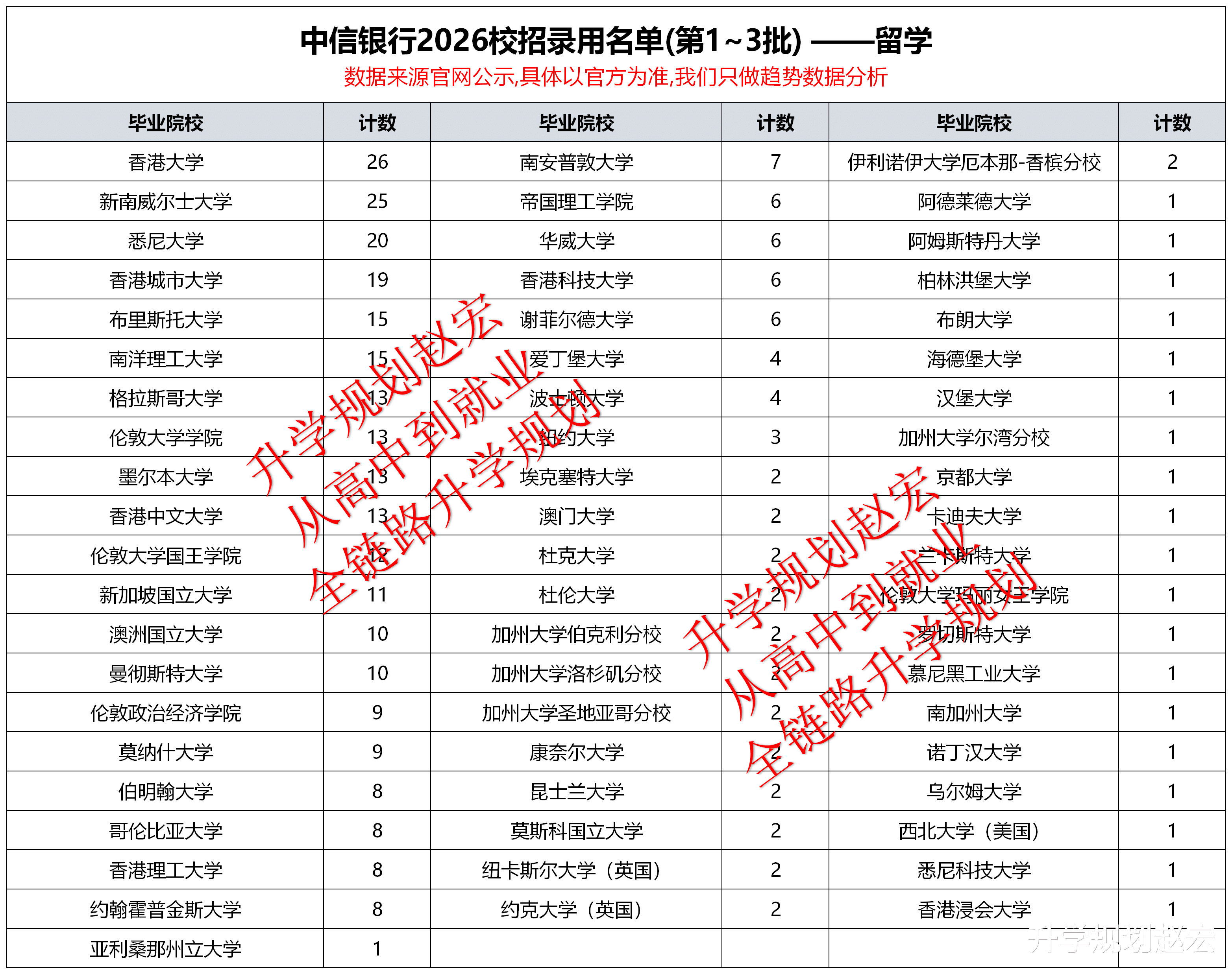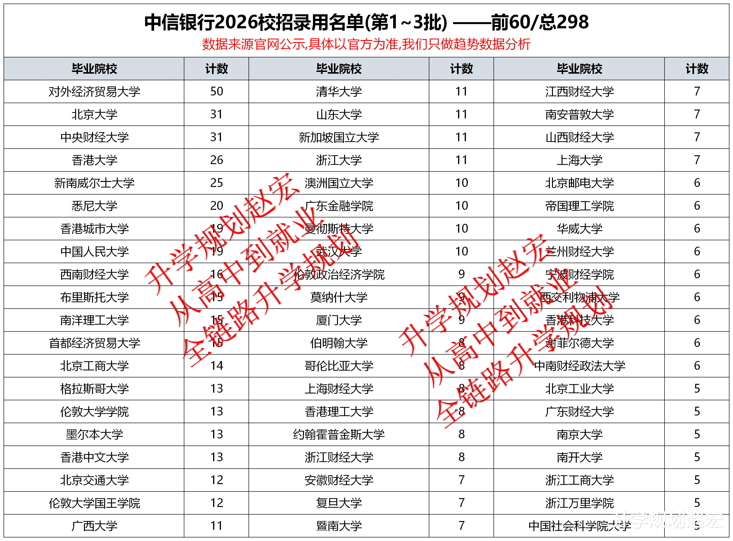 前三批总共1093人,第一批143人,第二批132人,第三批818人。生源院校298所,我们这儿只展示前60,人数最多的是对外经济贸易大学50人,然后是北京大学核中央财经大学31人,接下来是香港大学26人和新南威尔士大学25人。排在前面的院校其实都规律,如果结合整体数据比较,基本上也大致差不多,也就是说中信银行的偏好差不多。前60的院校当中,留学院校数量也非常明显。同样前面的院校当中,有名校,也有普通的一本线院校,还有一部分学院。如果咱们往这些方向走,可以提前去好好研究。