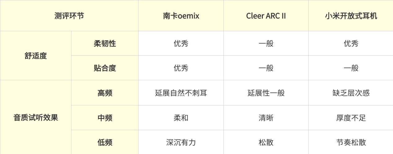 经过对比南卡OE MIX、Cleer ARC 2和小米开放式耳机,南卡OE MIX的综合表现最为出色。它搭载了最新蓝牙技术,连接迅速且稳定,佩戴感极为舒适,长时间使用也不会感到疲劳。音质和降噪效果都很优秀,无论听音乐还是通话,声音都清晰纯净,整体体验非常棒。