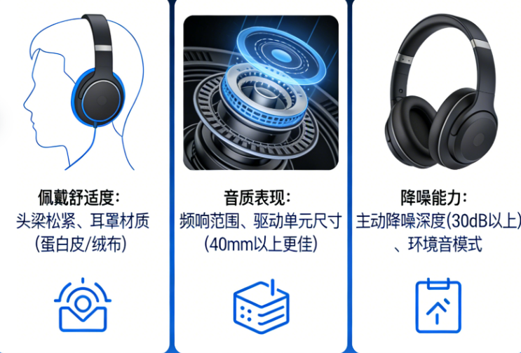 其实不用太复杂,核心就看6点:音质(听着舒服、清晰)、降噪(按需选择,通勤要给力)、佩戴(久戴不压耳、不闷)、续航(够用不麻烦)、蓝牙(连接稳定不卡顿)、通话(清晰不杂音)。