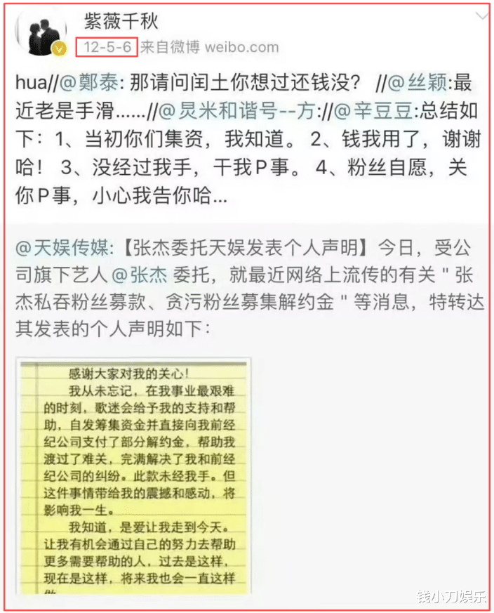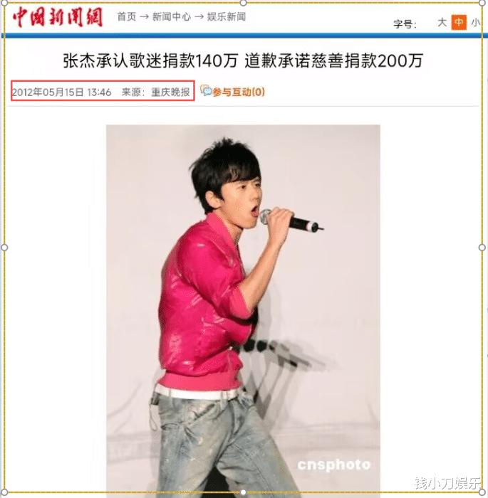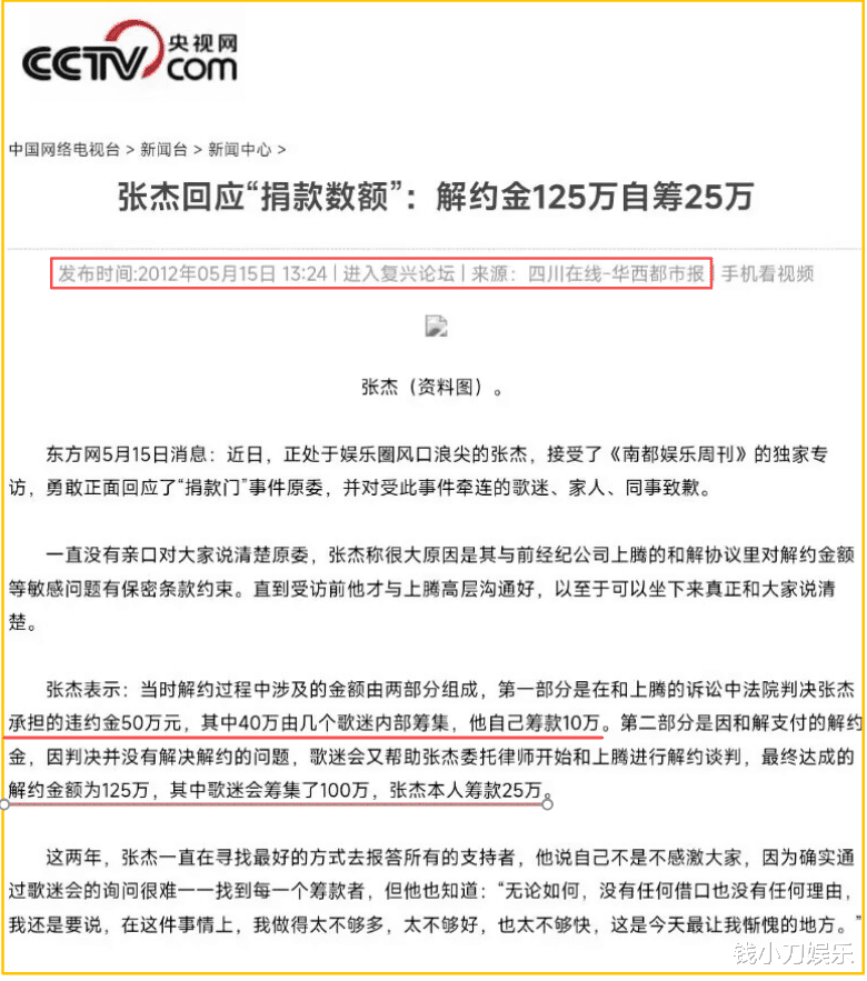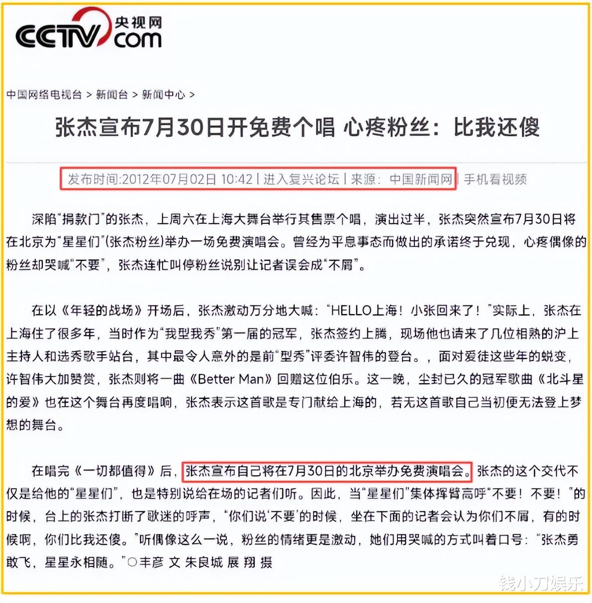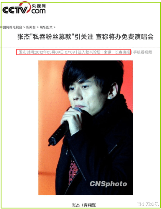 2012年5月9日,长春晚报发文:张杰“私吞粉丝募款”引关注,宣称将办免费演唱会