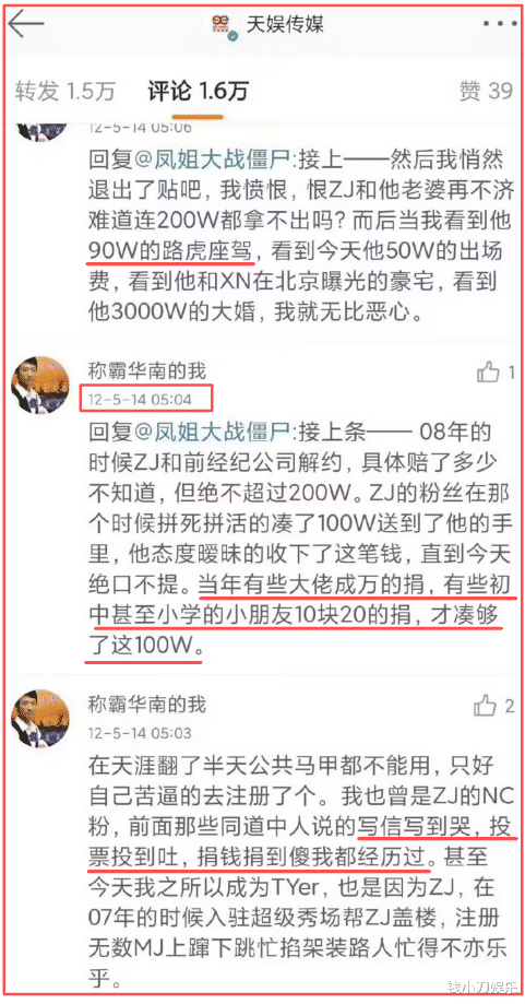 2012年5月14日,一位已经脱粉的张杰前粉丝给天娱传媒留言,称当年给张杰捐款的粉丝里有很多初中生和小学生,那些钱是10块20块这样凑出来的。