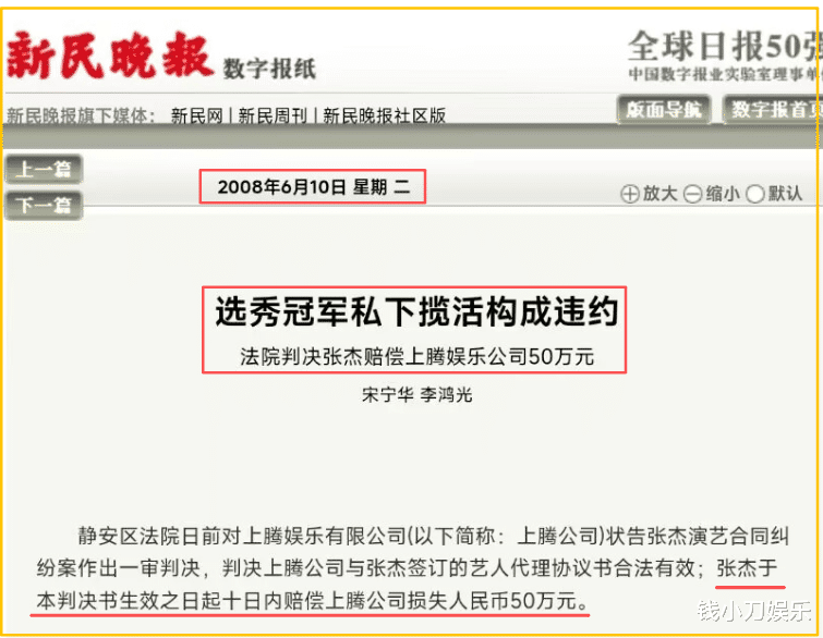 2008年6月10日,上腾娱乐胜诉,法院判决张杰赔偿上腾公司50万元。