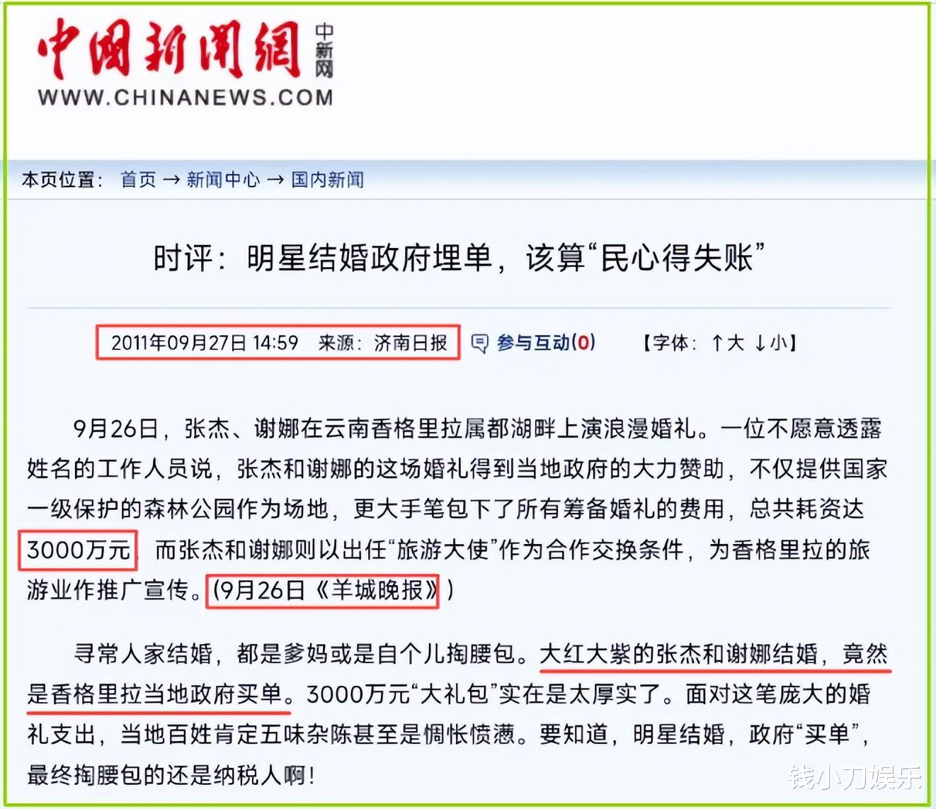 2011年9月26日,靠着粉丝成功解约的张杰,和著名女星谢娜在香格里拉举办了一场浪漫的婚礼,据传这场婚礼总花费3000万,由当地政府买单。