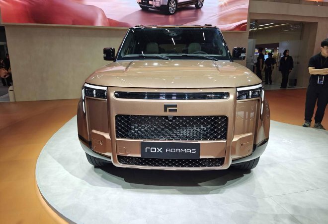 先说这面相,极石ADAMAS在原先硬朗的方盒子造型上做了些精修。车身同色的前格栅边框、封闭式的前杠细节,配上新的21英寸大轮毂,尤其是新增的“流沙金”车色,让它少了几分粗犷,多了几分精致和户外装备的质感。它不像理想L7那样用流畅圆润的线条传递温馨的家庭感,而是用一种更方正、更强调体量感的方式,彰显自己的“硬派豪华”身份。开它出去,别人不会认错成理想,这就是它设计上成功的第一步。