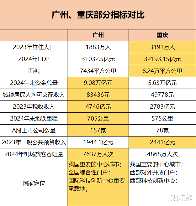 你要知道,重庆的面积是广州的11倍,人口是广州的2倍多。作为一个直辖市,它拥有庞大的体量和资源调配能力。而广州,仅仅是一个普通省会城市,在不到7500平方公里的土地上(不到重庆的1/10),承载了近1900万的人口,产出了惊人的经济增量。