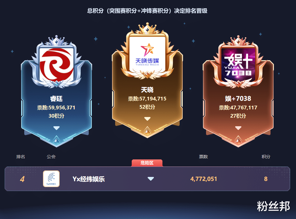 除此之外,娱加主播AK也在比赛期间展现了不俗的拉票能力,进一步巩固了娱加的优势。反观睿廷公会,虽未能登顶,但其表现同样可圈可点。依托旗下强大的电母矩阵和极具诱惑力的奖励机制,睿廷始终紧咬比分,展现了作为头部主流公会的强大实力与韧性。