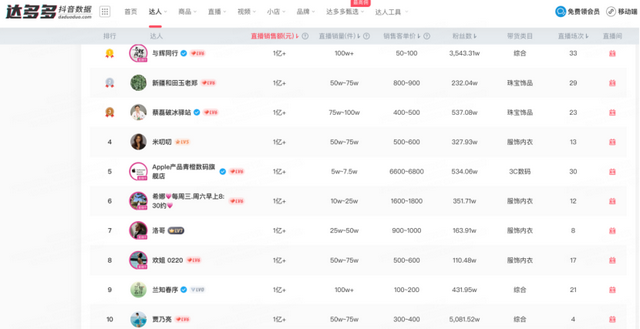 相比之下,抖音带货月榜TOP10直播间大多有着极强的IP坐镇,形成核心流量。