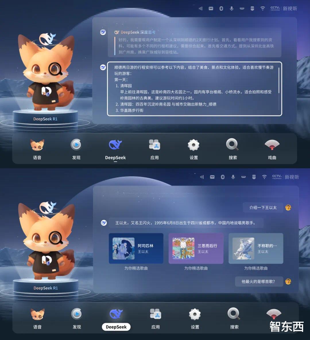 2月13日,长虹宣布所有搭载了沧海智能体的长虹AI TV,均已接入DeepSeek模型。在长虹AI TV上,用户可以自行选择是用DeepSeek“深度思考”模式,还是“快速响应”模式,前者由DeepSeek-R1满血版支持。