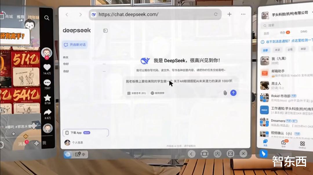 部分智能硬件厂商虽然尚未把DeepSeek能力直接整合到其产品中,但已经在研究结合DeepSeek的使用场景。 例如 Rokid 上周演示了其AR眼镜Rokid AR Lite可分屏使用DeepSeek网页版,以便打工 人用AI功能同时处理多项任务。