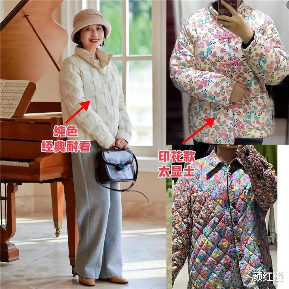 穿衣打扮最忌讳的就是整体造型,花里胡哨的色彩,例如下面这一件印花的羽绒服穿在身上之后,是不是就显得土气廉价?