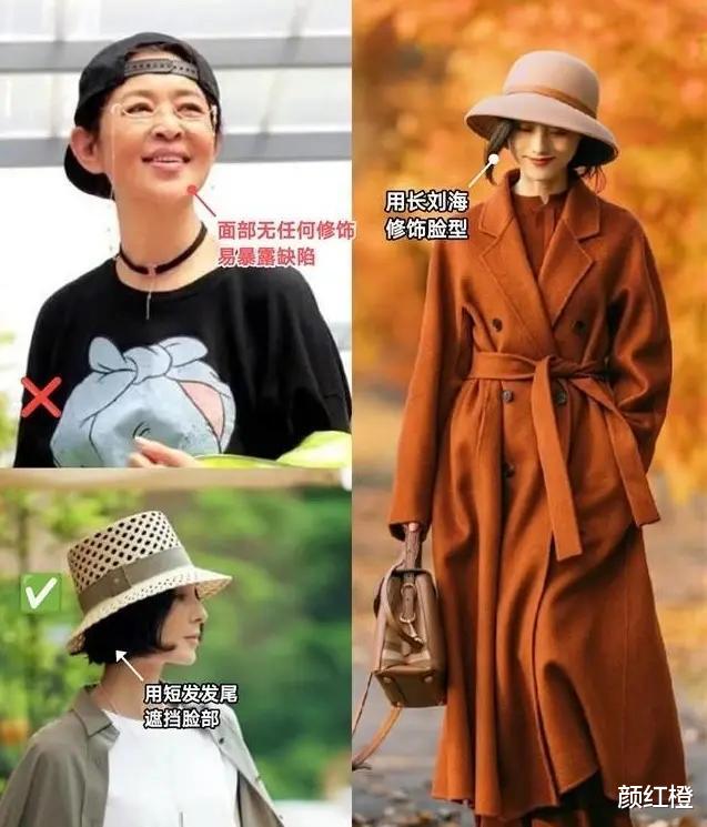 这是一款帽子,也很重要,比如说下面这两位素人戴的帽子,一款是黄色的平底帽,色彩过于鲜艳,再搭配上拼接色的衬衫上衣,整个人就无法戴出那种氛围感,和高级感。