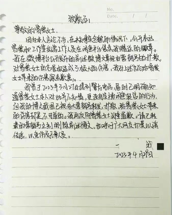 2023年3月26日,一名粉丝在社交平台发文控诉,称自己亲手送给演员曾黎的定制徽章,竟出现在某二手交易平台标价出售。此事迅速引发热议,网友直指"践踏粉丝心意"。当日,@曾黎工作室紧急发布声明,将责任推给"某员工私自行为",并强调已开除涉事人员并报警。然而,这场风波的真正高潮却在1个月后到来——4月29日,最初爆料的网友突然通过工作室微博发布致歉函,承认自己"未了解全貌",而曾黎本人更以"抱抱你"的温情回复引爆舆论两极反应。