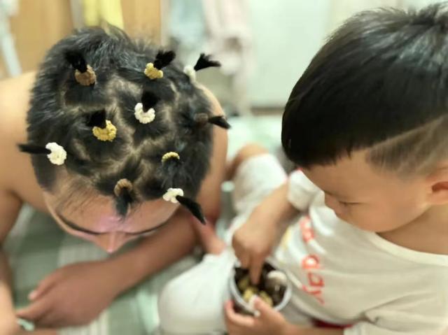 还有第三位出场的爸爸,估计也是在看手机吧,任由孩子在自己头上扎满了小辫,这位爸爸以后可小心了,自己的小辫子随便就被孩子揪住,这可如何是好?