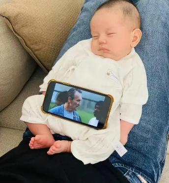 还有这位宝宝内心OS:终于把爸爸给哄睡着了,本宝宝可以好好看会手机了。