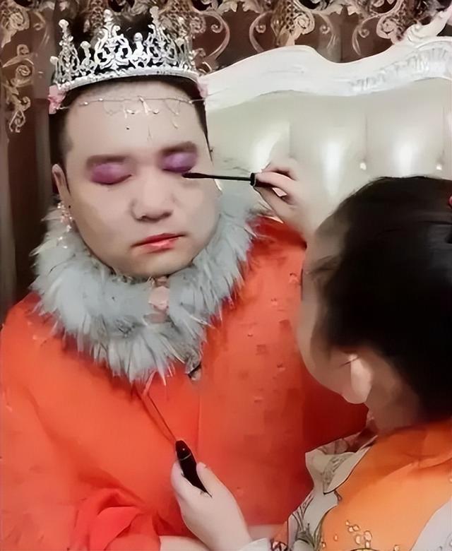 首先出场的是这位“贵妇”老爸,紫色的眼影,bilibili的彩妆,头上的王冠、还有额头的饰品,配上一副生无可恋的表情,这画风也是清奇的很;