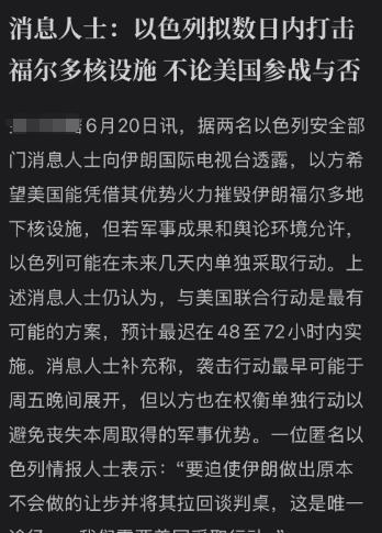 “以色列打算在数日内打击伊朗位于福尔多地下的核设施,不论美国参战与否”。