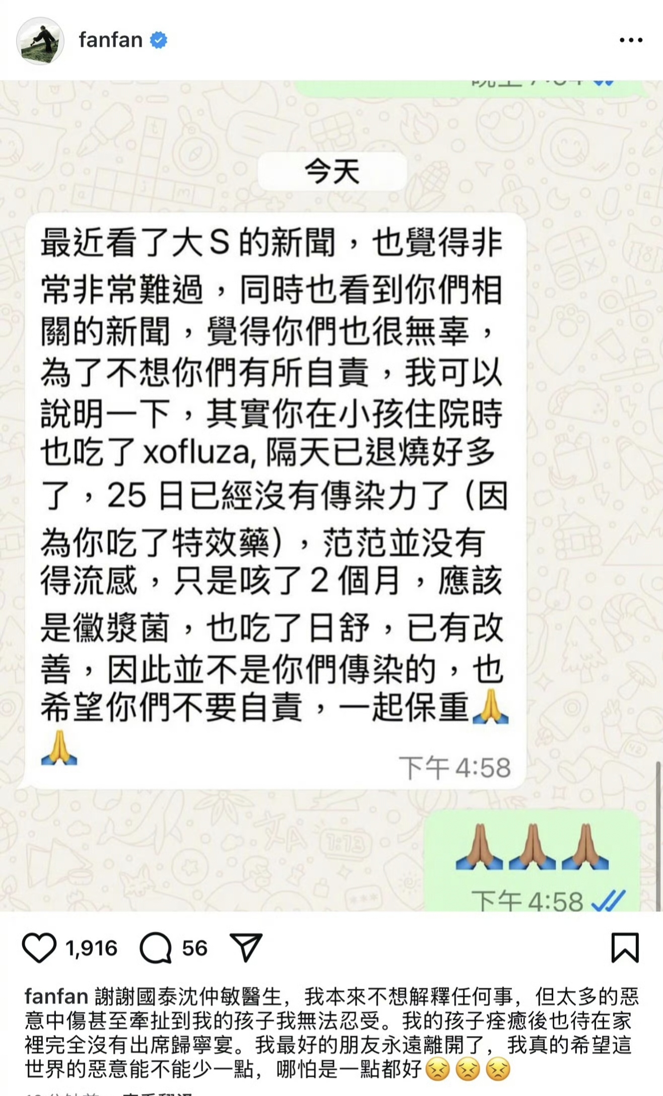 范玮琪在社交媒体上晒出了与医生的对话截图。从截图中可以看到,医生明确表示,范玮琪本人并没有感染流感,只是咳嗽了两个月,病因可能是霉浆菌感染。同时,医生还解释道,陈建州在孩子住院时就已经服用了抗流感药物,1月25日时就不再具有传染力。医生暖心地安慰范玮琪:“这不是你们传染的,别自责,大家一起保重身体!”
