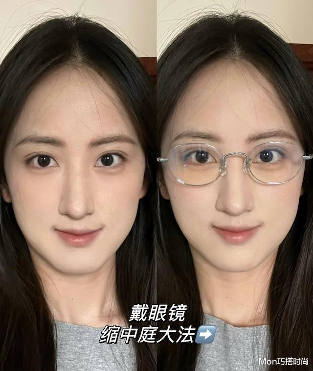 但借助眼镜,能够巧妙地改善这一状况,特别是选择低中梁的镜框对长中庭的修饰效果会很好,镜框的位置相对较低,能够在视觉上缩短中庭的长度,平衡五官比例,提升整体颜值。