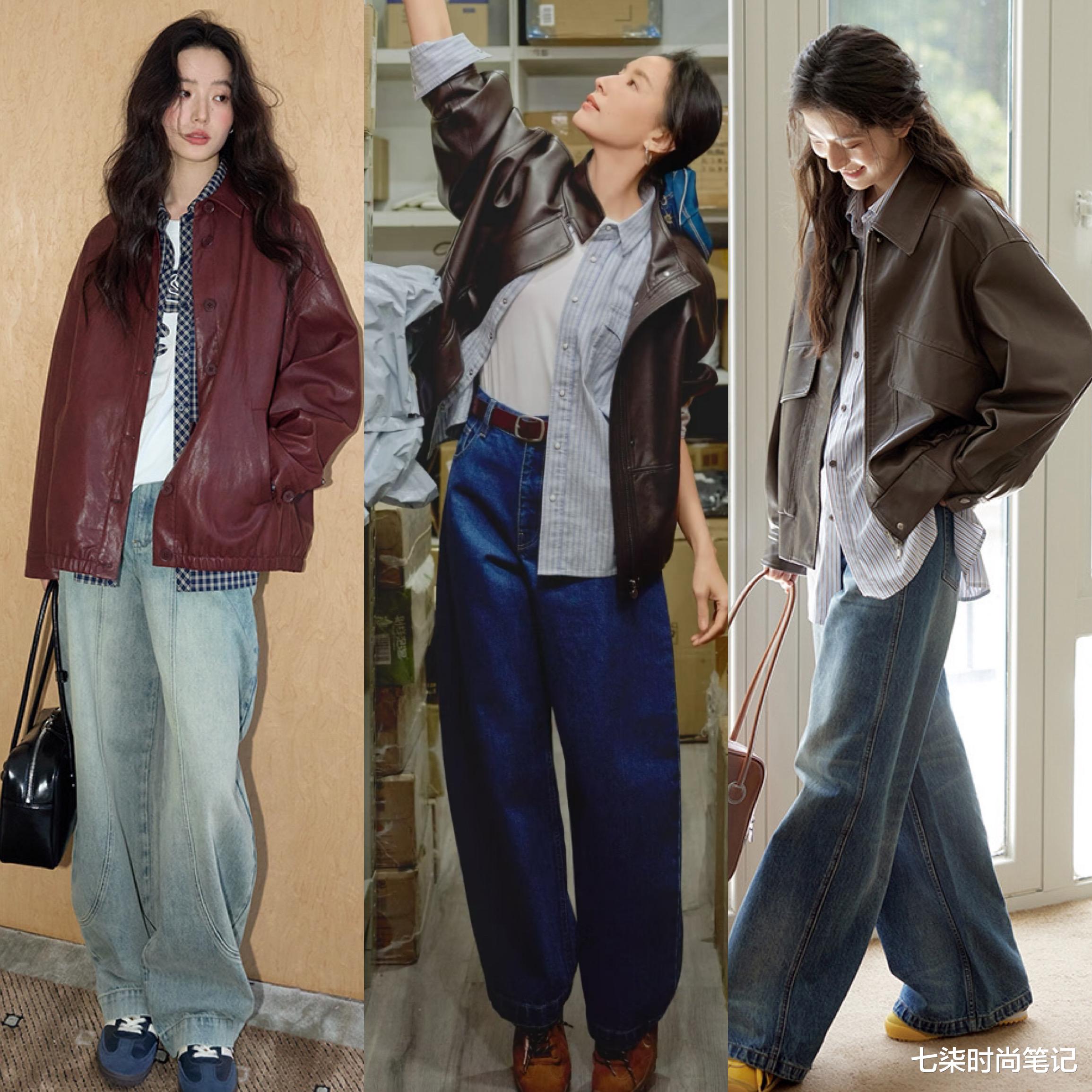 休闲的阔腿牛仔裤与皮衣也是绝配,两者搭配在一起,既不会显得过于正式,又能增添一份时尚感。